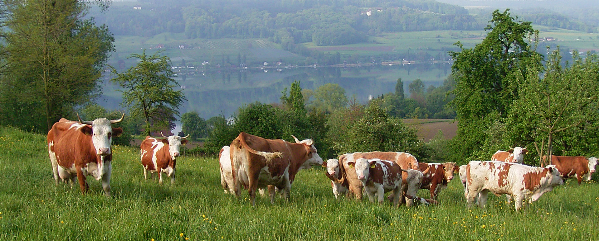 Unsere Kuhherde einer kleinen Nutztierrasse mit großen Klauen lebt im Naturschutzgebiet als Landschaftspfleger. Sie ernährt sich ausschließlich und wiederkäuergerecht von Gräsern aus absolutem Grünland. Durch saisonalen Weidegang unterstützen unsere Tiere die Artenvielfalt der hiesigen Bodenseelandschaft. Die muttergebundene Kälberaufzucht findet ganz natürlich statt.